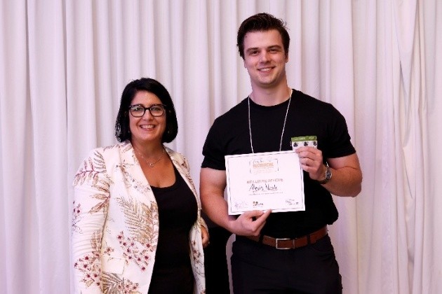De gauche à droite : Sophie Girard, directrice générale de la Corporation de recherche et d’action sur les maladies héréditaires (CORAMH), et Alexis Nicole, candidat à la maitrise en santé durable à l’Université du Québec à Chicoutimi.